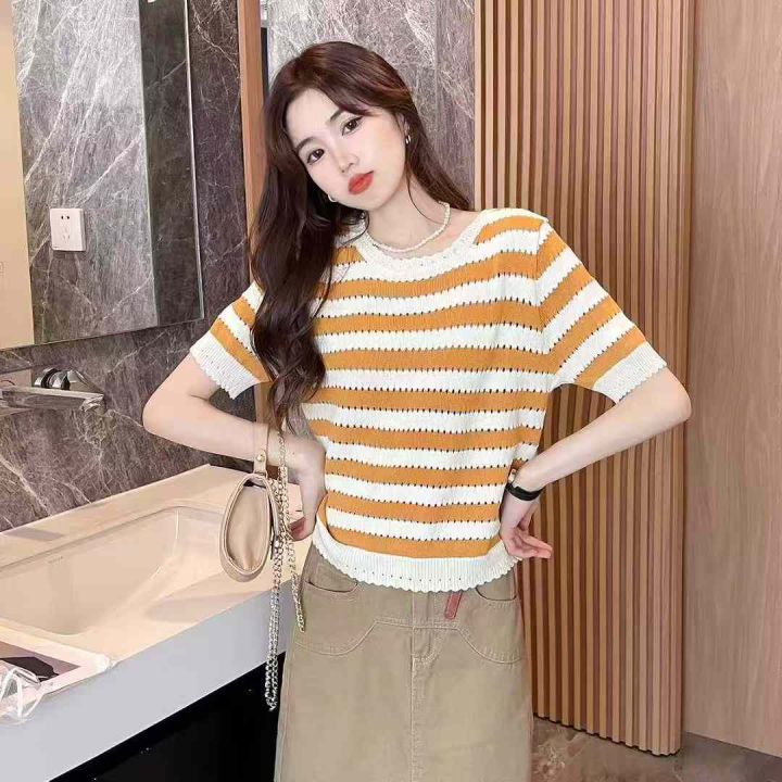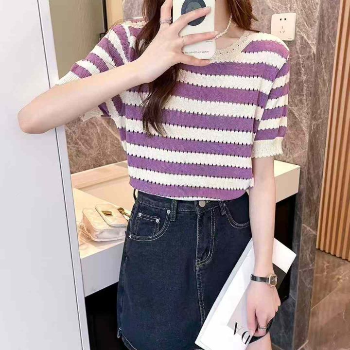 夏季新款港味风绝美撞色条纹圆领宽松正肩显瘦冰丝针织短袖,独立包装,均码面料柔软舒适,540件,全清5.9元超低价秒杀!分货加一!。 货号:1303
