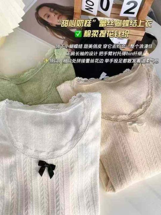 早秋新款韩系穿搭甜心奶糕蕾丝拼接蝴蝶结柔棉提花长袖...