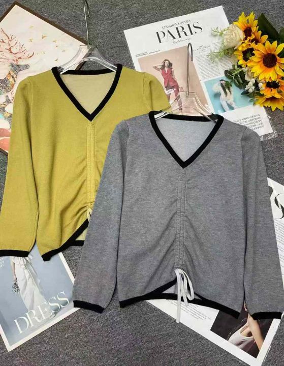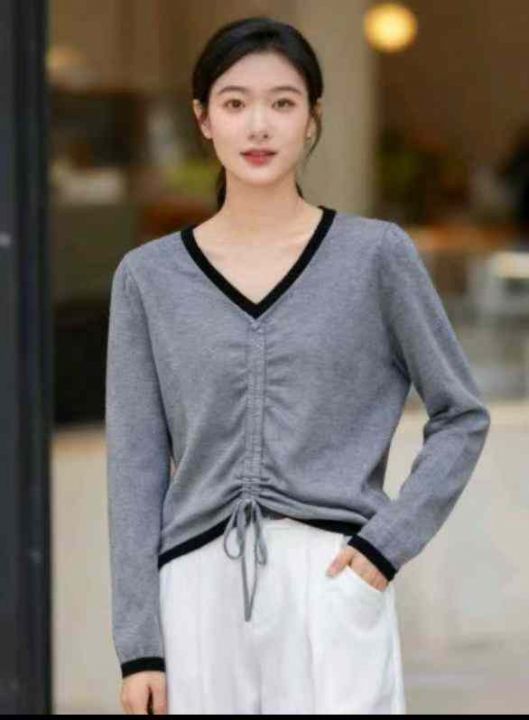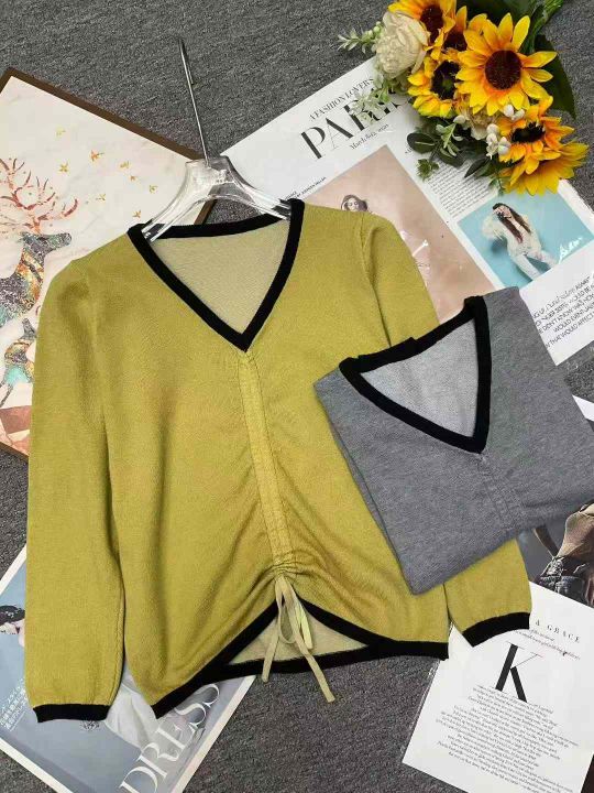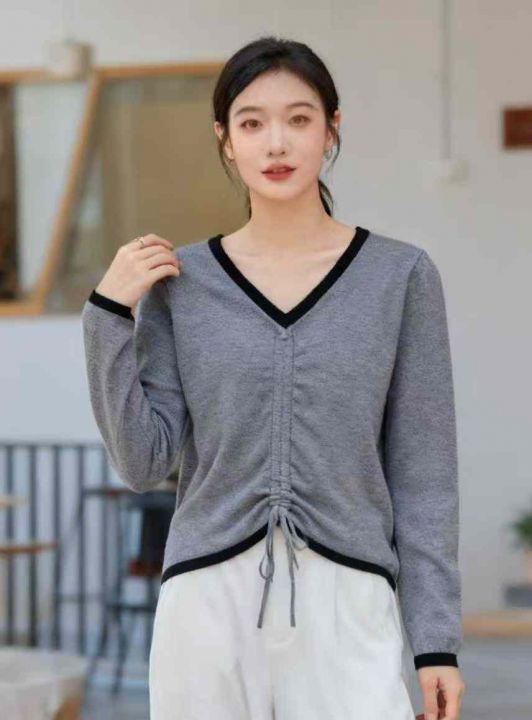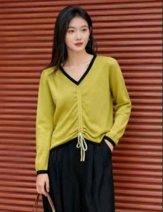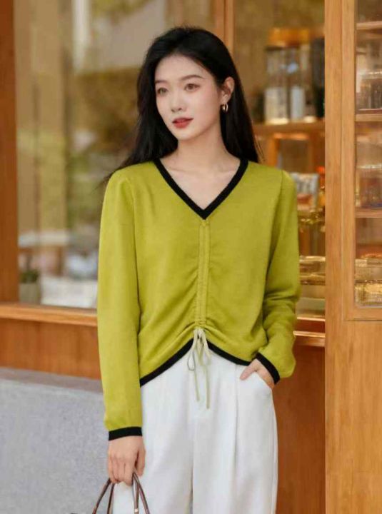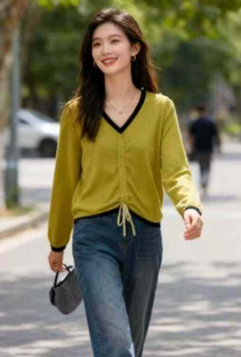 秋季新品宽松慵懒风韩版小心机抽绳V领套头毛衣,独立...