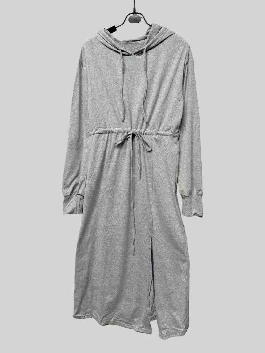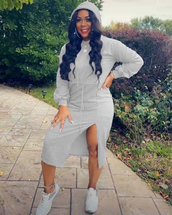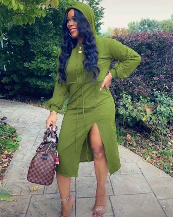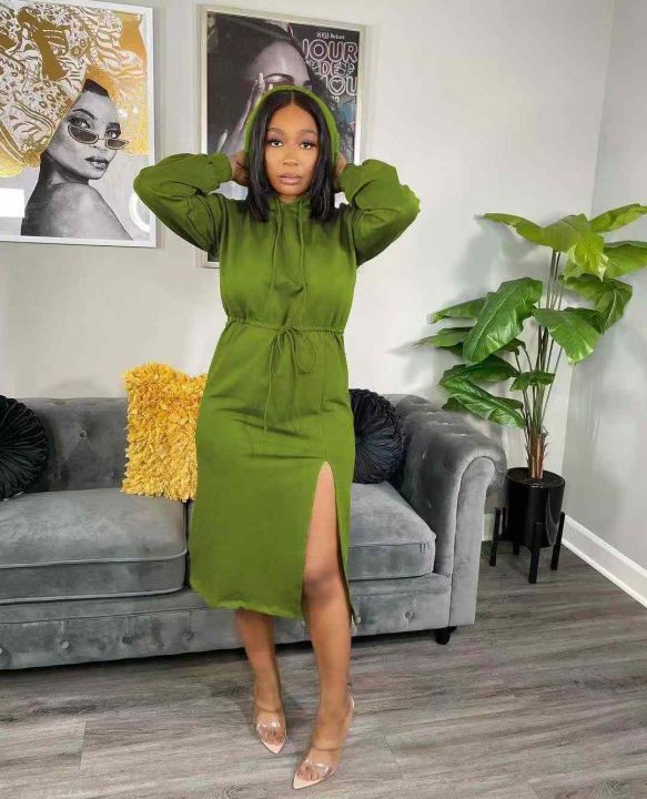 欧美时尚通勤连帽系带长袖开叉连衣裙,整款三色,数量98件,码数S-2XL,有收腰设计,高弹力,品质好,有独立包装。