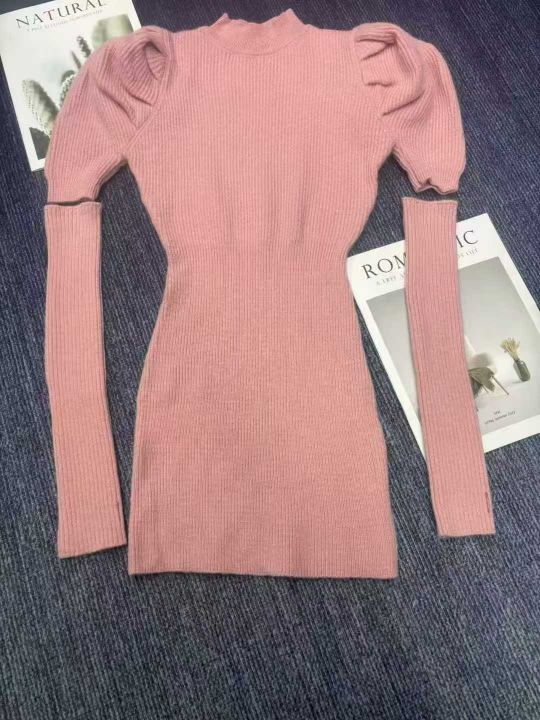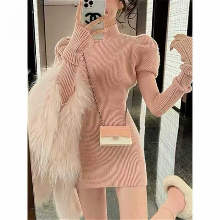 新款针织辣妹连衣裙秋冬季设计感泡泡袖打底内搭毛衣裙...