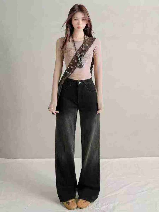 2025新款女士秋季高腰显瘦渐变黑灰色阔腿直筒牛仔裤36...