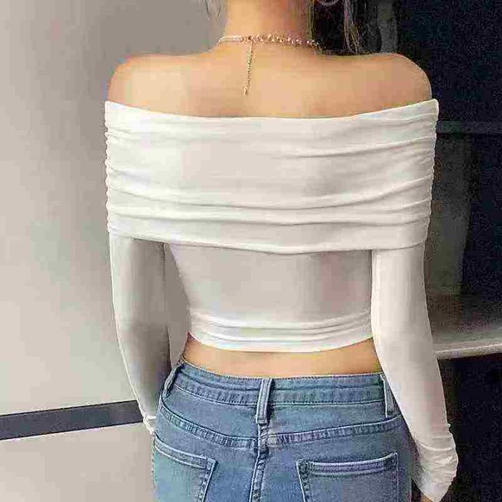 4.5清152件女靓妹辣妹性感一字肩褶皱长袖上衣女秋季短款修身显瘦气质百搭T...