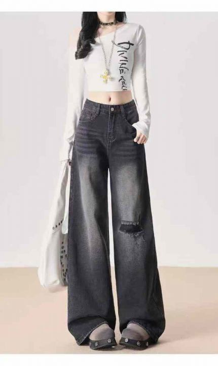 秋季新品黑色甜酷复古高腰阔腿牛仔裤,独立包装带吊牌...