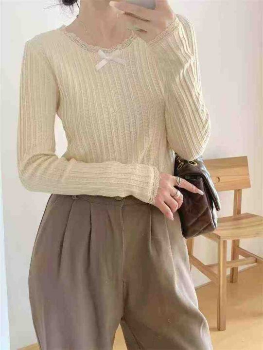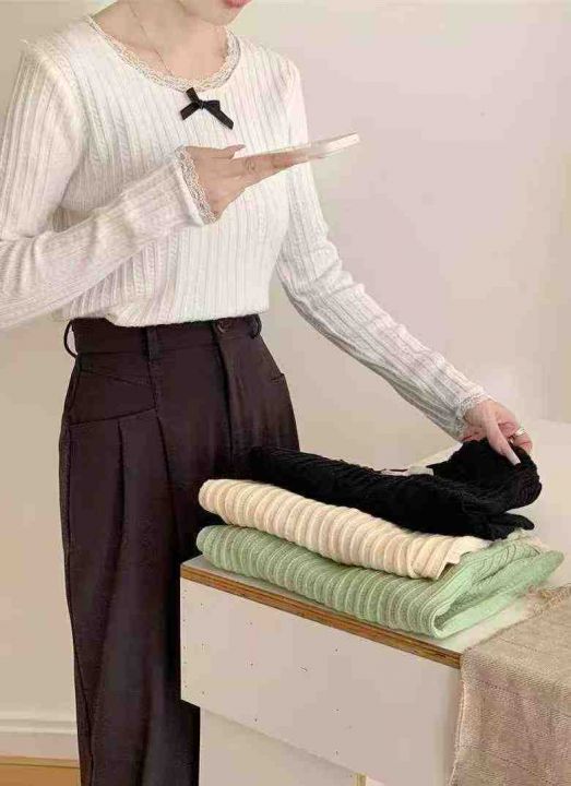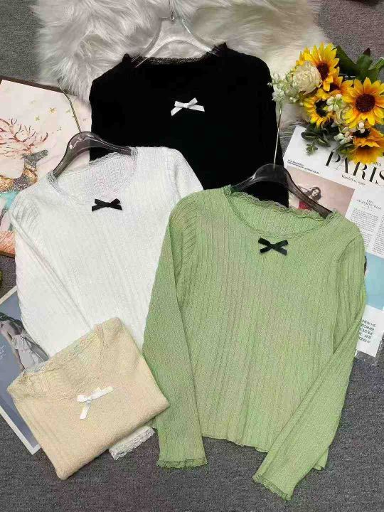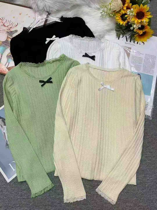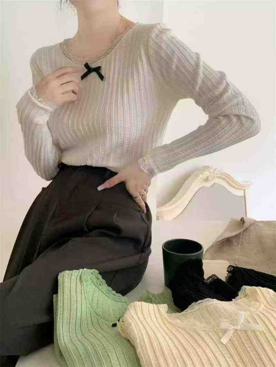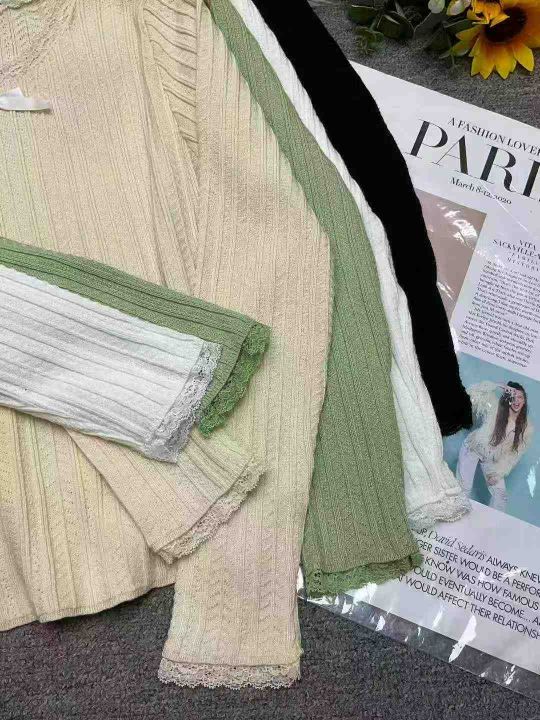 早秋新款韩系穿搭甜心奶糕蕾丝拼接蝴蝶结柔棉提花长袖针织套头毛衣,独立包装,均码面料柔软舒适弹力大,450件,全清6.9元超低价秒杀!分货加一!
