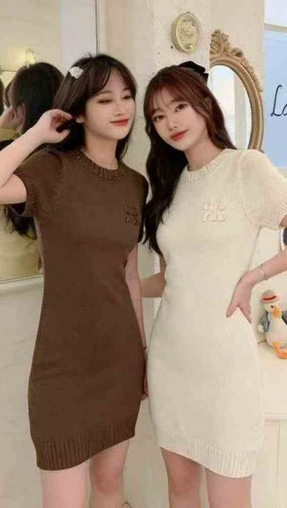 春夏季新款气质简约纯色刺绣小标圆领弹力修身显瘦针织连衣裙,独立包装,均...