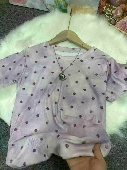 重工晕染波点圆领短袖T恤女夏季设计感显瘦遮肉气质上衣,整款2色,紫色为主,弹力超大,2到5码,3200件左右,4.9秒杀,分货加1