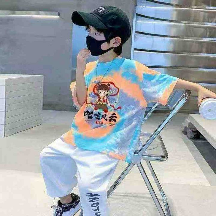 哪吒中大童纯棉短袖卡通动漫T恤宽松洋气透气扎染,数量443件,码数130-170,独立包装后领包边,全清4.8元。 货号:1303
