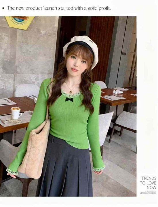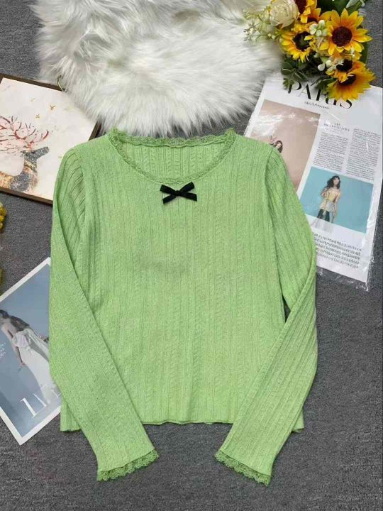早秋新款韩系穿搭甜心奶糕蕾丝拼接蝴蝶结柔棉提花长袖针织套头毛衣,独立包装,均码面料柔软舒适弹力大,210件,全清6.9元超低价秒杀!。 货号:1303