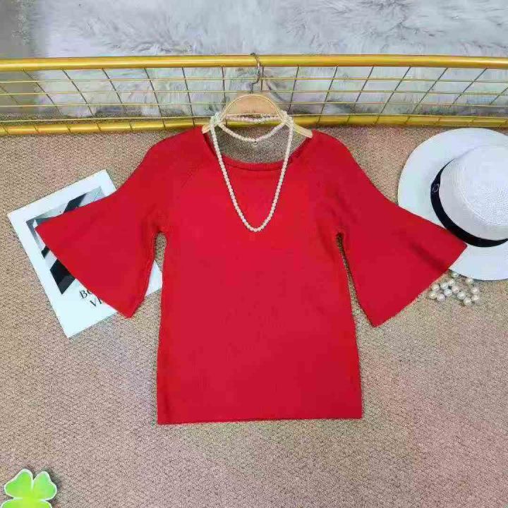 夏款 圆领五分袖短款冰丝针织衫女装时尚套头喇叭袖打底衫上衣,数量110件,...