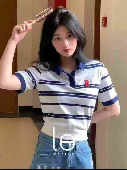 正肩短袖t恤女短款辣妹小众条纹翻领polo衫,独立包装,后领包边,重工刺绣,码数1-5点(S-2XL),数量616件,分货加1,货号109#17