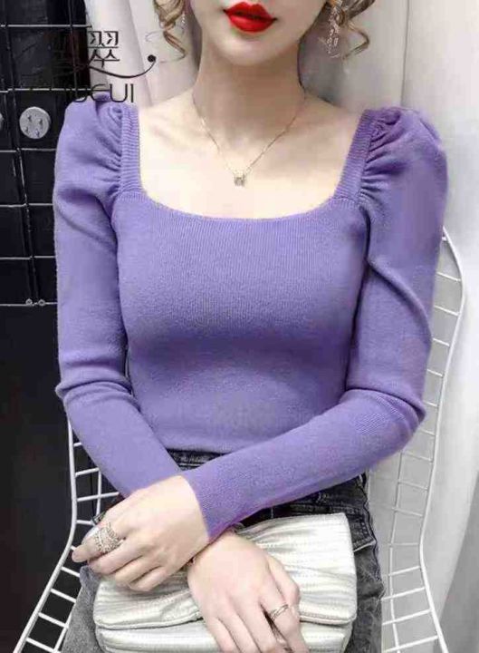 秋冬季新品洋气泡泡袖方领弹力修身气质套头毛衣,独立包装,均码面料柔软舒...