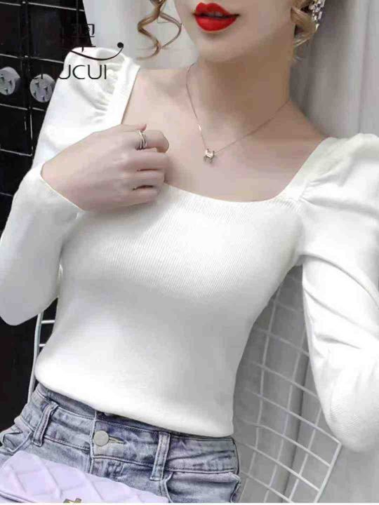 秋冬季新品洋气泡泡袖方领弹力修身气质套头毛衣,独立包装,均码面料柔软舒...