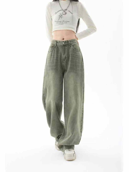 品牌原单高腰宽松复古直筒阔腿牛仔长裤,独立包装带吊...