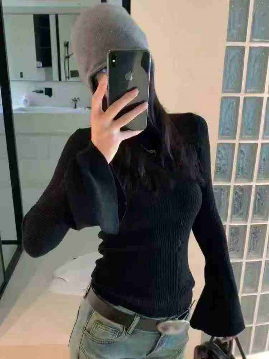 70件左右韩系黑色圆领喇叭袖包芯纱针织衫女早秋小个子...