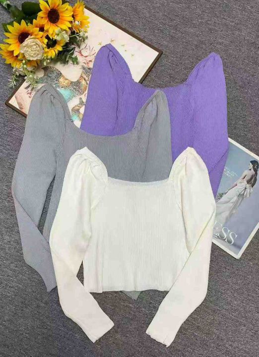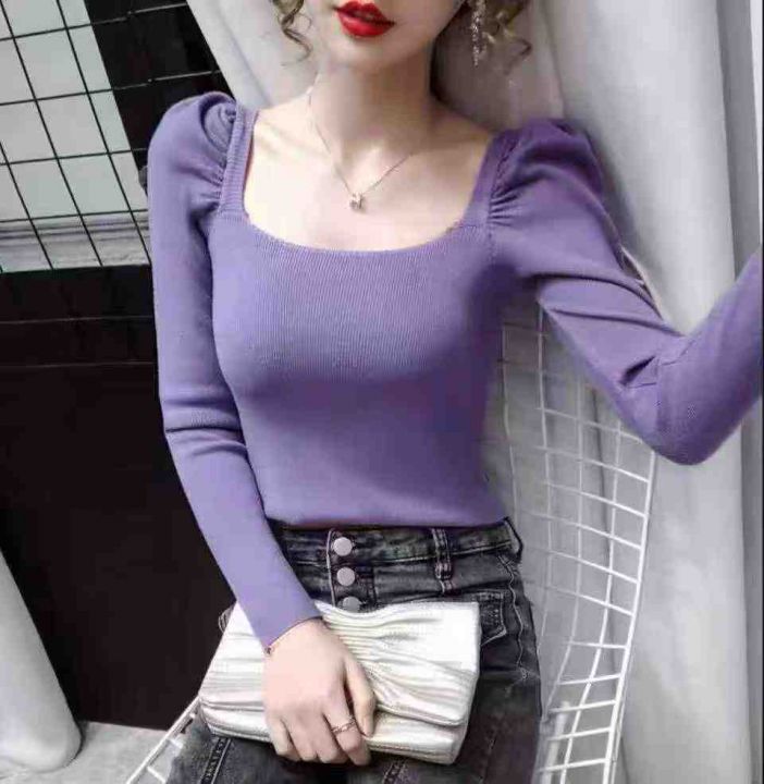 秋冬季新品洋气泡泡袖方领弹力修身气质套头毛衣,独立...
