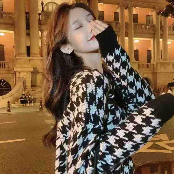 9.9清52件女装圆领千鸟格套头毛衣,宽松大版慵懒风,...