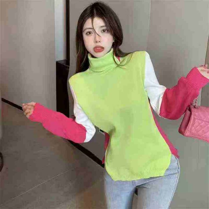 1500件左右秋冬新款半高领宽松拼色显瘦长袖内搭时尚针...