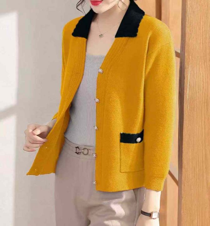 早秋新款小香风撞色翻领温柔风减龄百搭宽松显瘦毛衣开...
