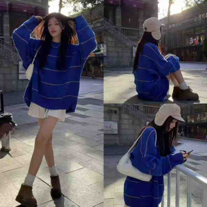 秋冬新款宽松慵懒风撞色条纹落肩北极绒套头毛衣,独立...