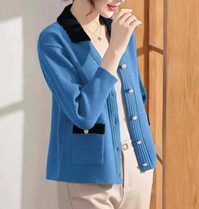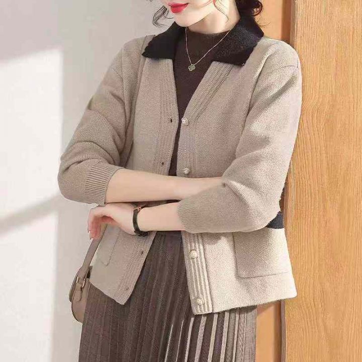 早秋新款小香风撞色翻领温柔风减龄百搭宽松显瘦毛衣开...