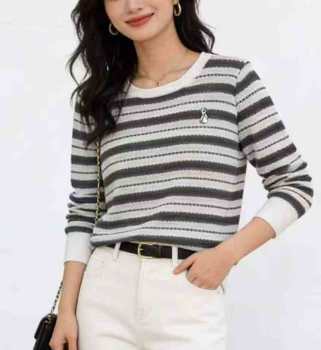 春秋新款刺绣小标韩系撞色条纹宽松百搭针织圆领套头毛衣,独立包装,均码面...