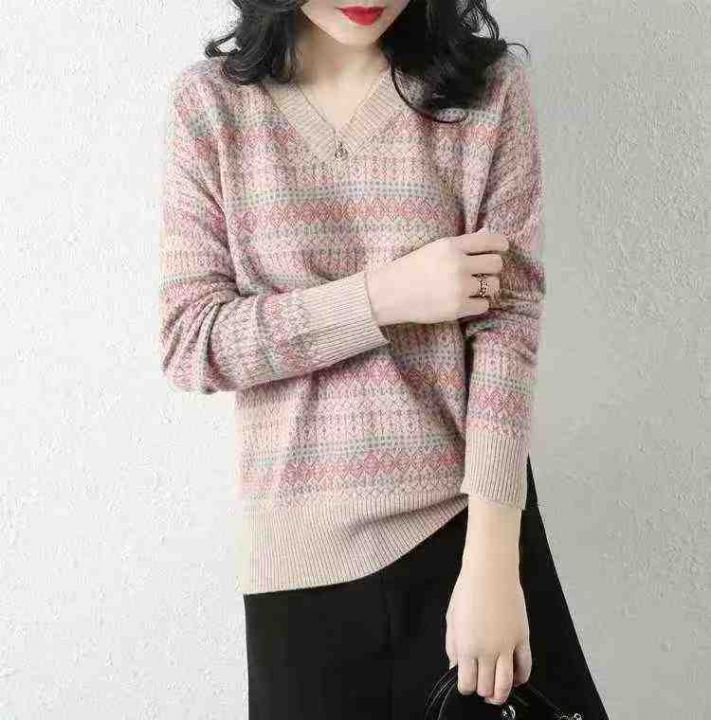 秋冬新款V领提花宽松慵懒风包芯纱套头毛衣,独立包装...