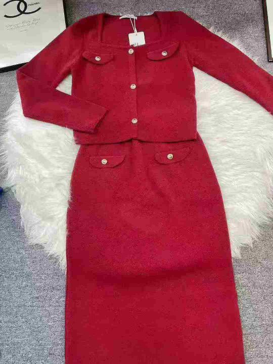 全清22.8,2025新款女富家千金短款方领针织毛衣圣诞红色高腰显瘦半身裙套装,码数m到2xl,31套不分货