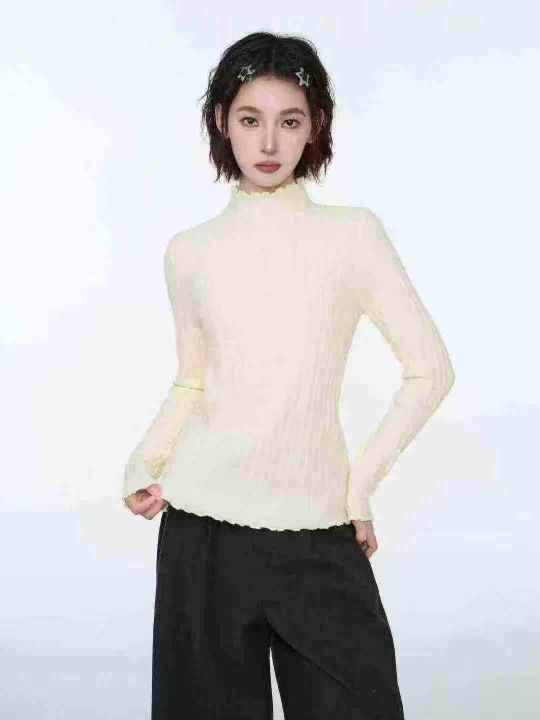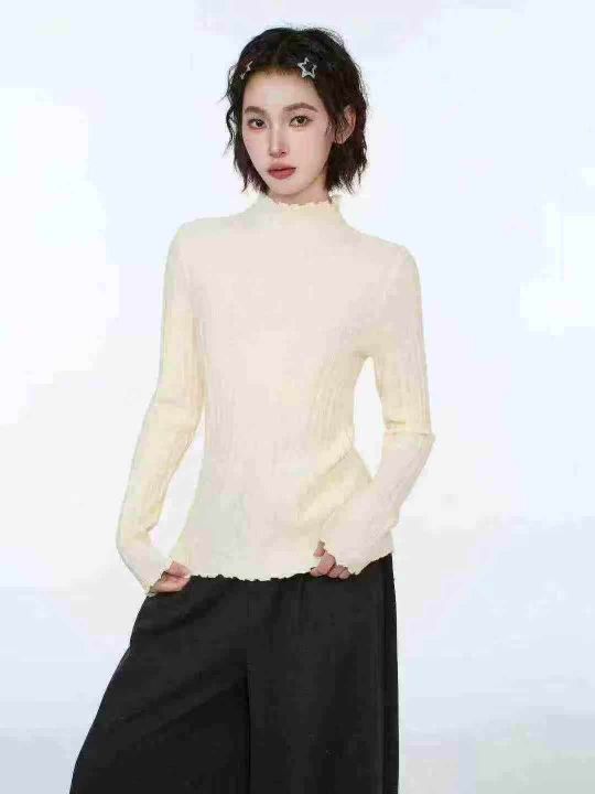 修身百搭半高领木耳边长袖打底衫针织衫,整款两色,手...