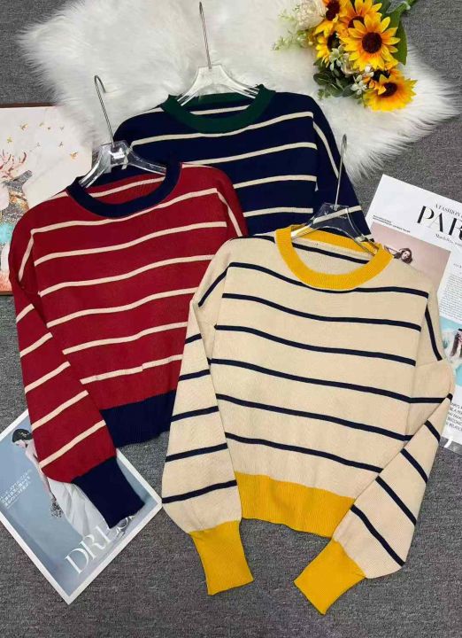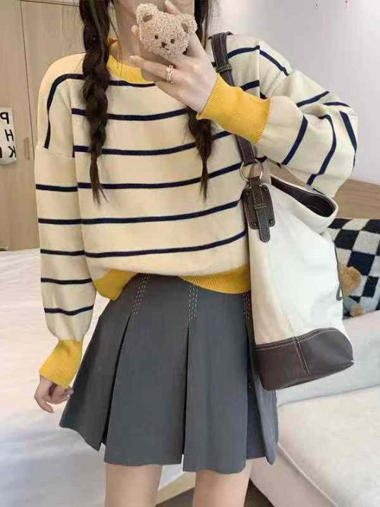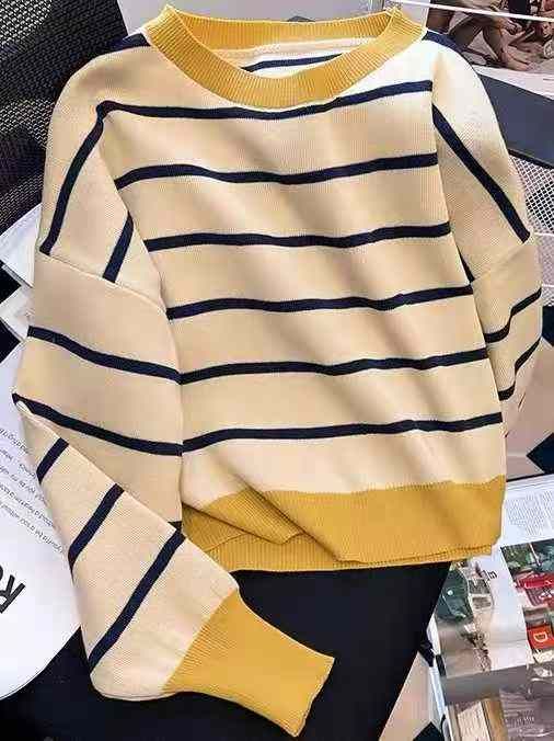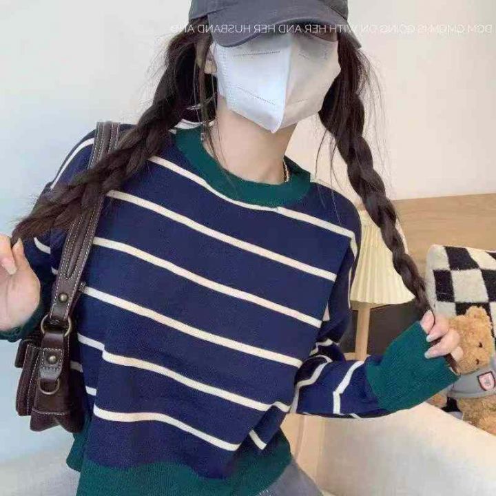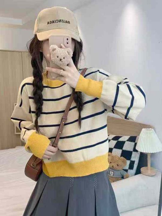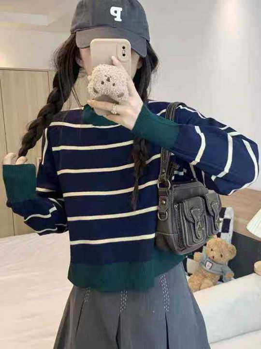 秋季新款短款宽松港味复古慵懒风撞色条纹针织套头毛衣...
