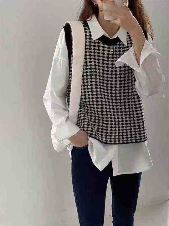 秋季新款韩版复古撞色提花宽松叠穿针织毛衣马甲背心,...