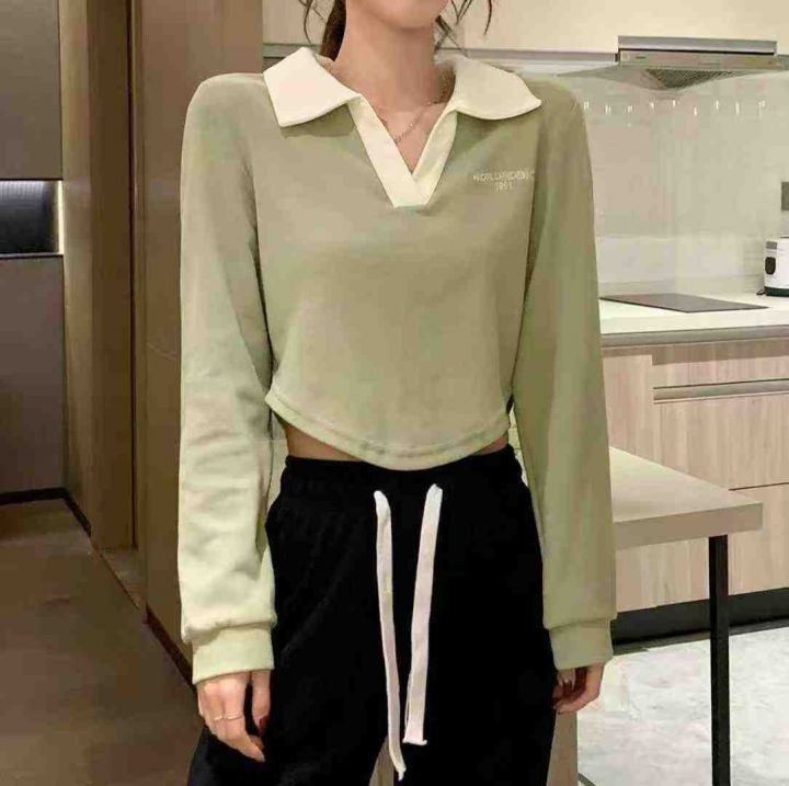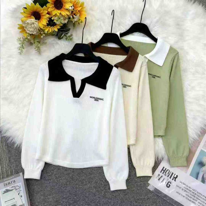 秋季新品撞色刺绣字母小清新百搭polo领针织套头毛衣,...