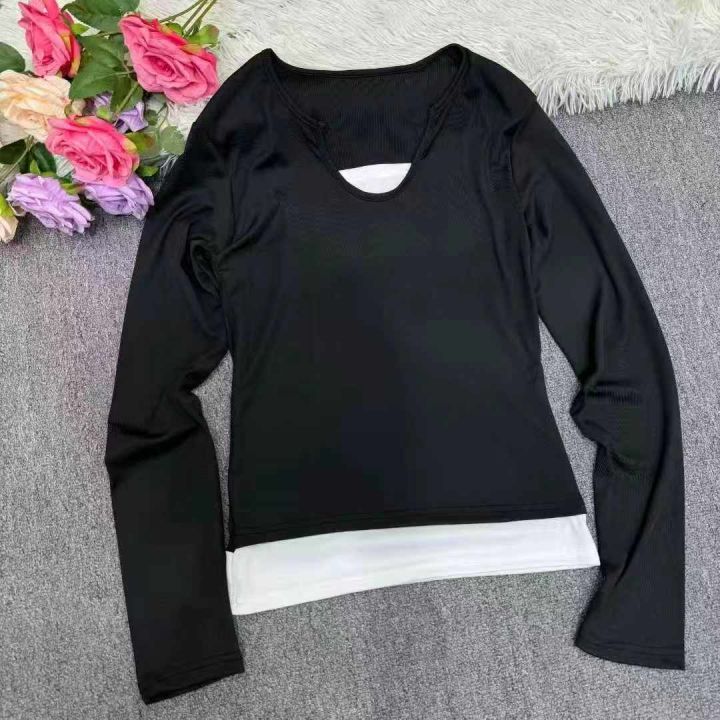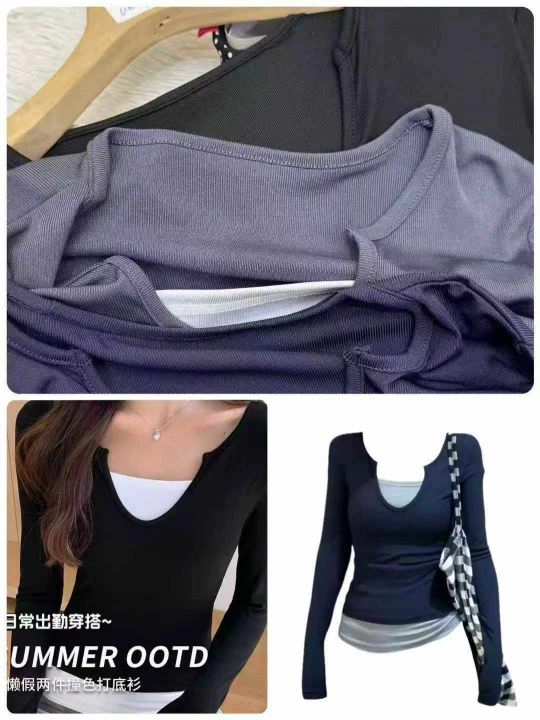 6180件\'美式甜辣妹韩版假两件长袖t恤女春夏修身打底衫撞色纯欲显瘦上衣,独立包装,码数M-2XL,全清5.8元\'分货➕0.5