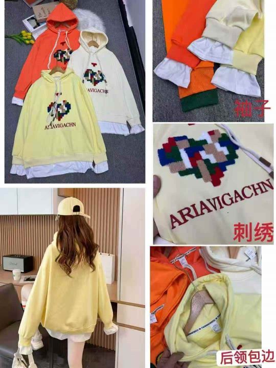 设计感小众大版慵懒风时尚休闲加绒假两件连帽卫衣,独立包装,两整款,后领包边,加绒,重工刺绣,码数1-5码,数量340件,分货加1,货号1029#64