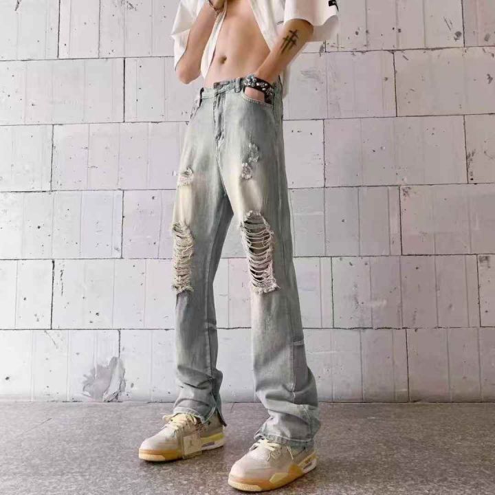 秋季新品复古做旧男女同款美式高街设计感直筒破洞窄版...