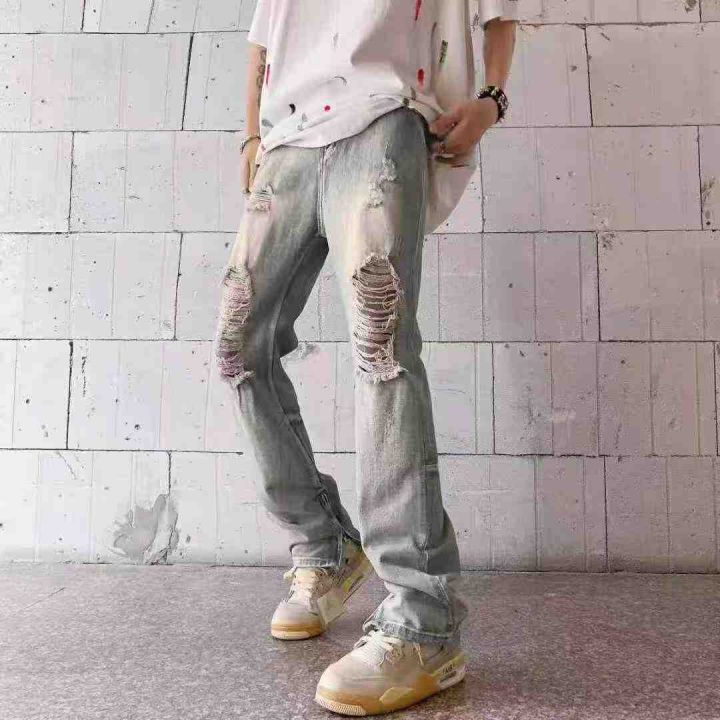 秋季新品复古做旧男女同款美式高街设计感直筒破洞窄版...
