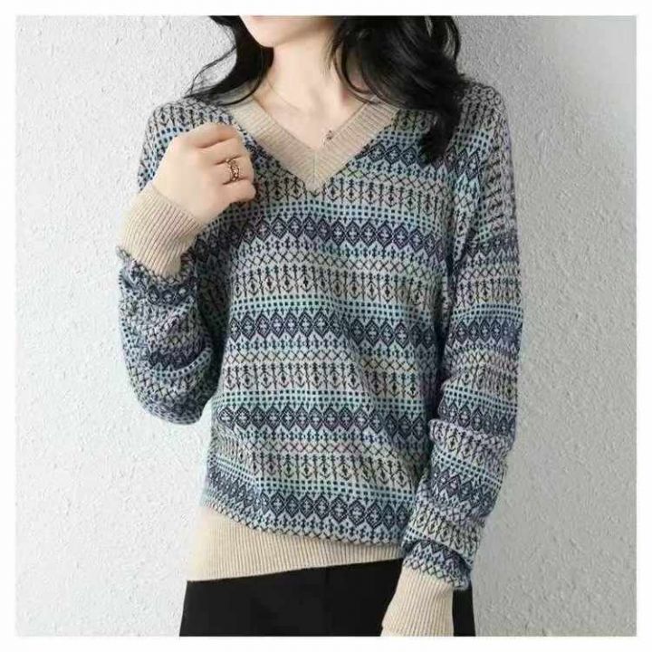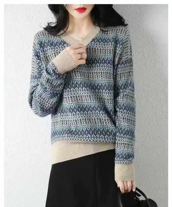 秋冬新款V领提花宽松慵懒风包芯纱套头毛衣,独立包装...