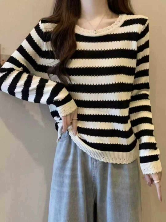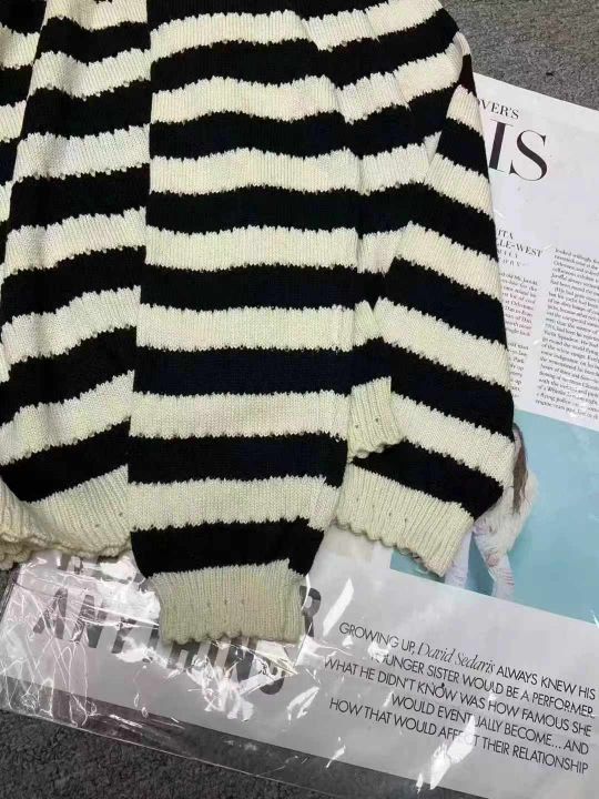 春秋新款撞色条纹时尚百搭宽松韩版针织毛衣套头毛衣,...