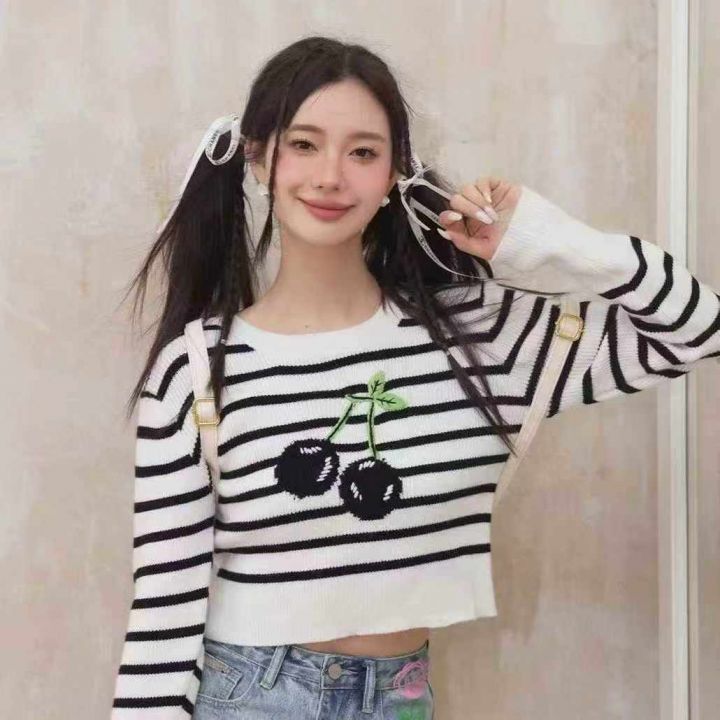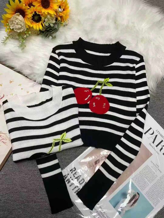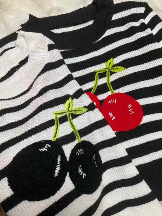 秋冬新款美式时尚辣妹樱桃刺绣植绒撞色条纹宽松显瘦套头毛衣,独立包装,均码面料柔软舒适弹力大,220件,全清6.9元超低价秒杀!