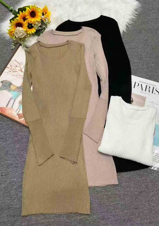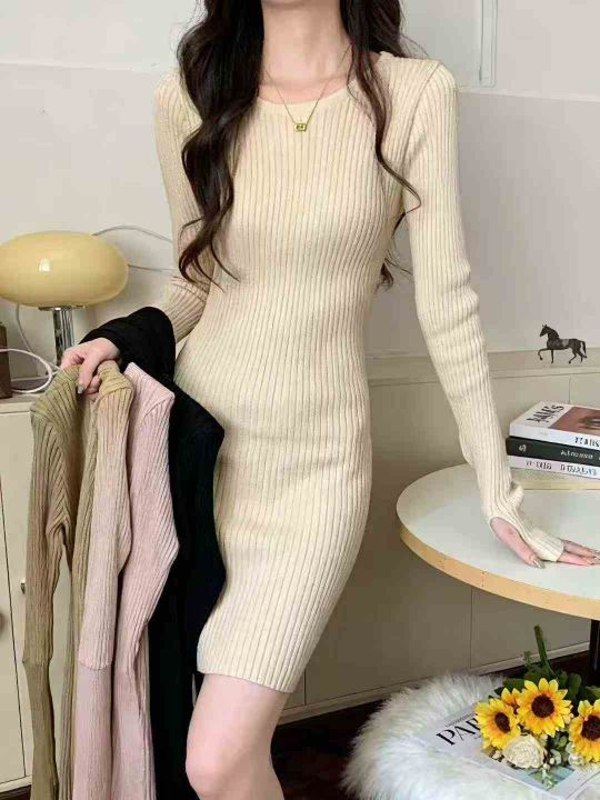 秋冬新款弹力修身显瘦坑条圆领毛衣连衣裙,独立包装,...
