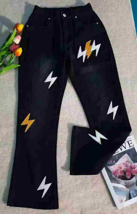 水洗棉直简微喇叭长裤松紧腰美式潮牌宽松闪电皮刺绣牛仔裤,488件,S-2XL,...