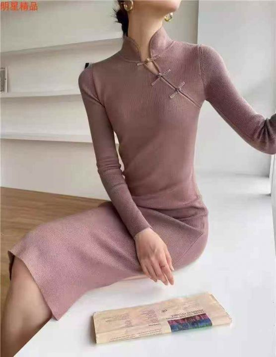 新中式国风盘扣旗袍毛衣连衣裙,女包臀开叉长裙,码数...