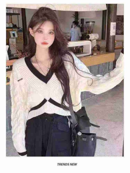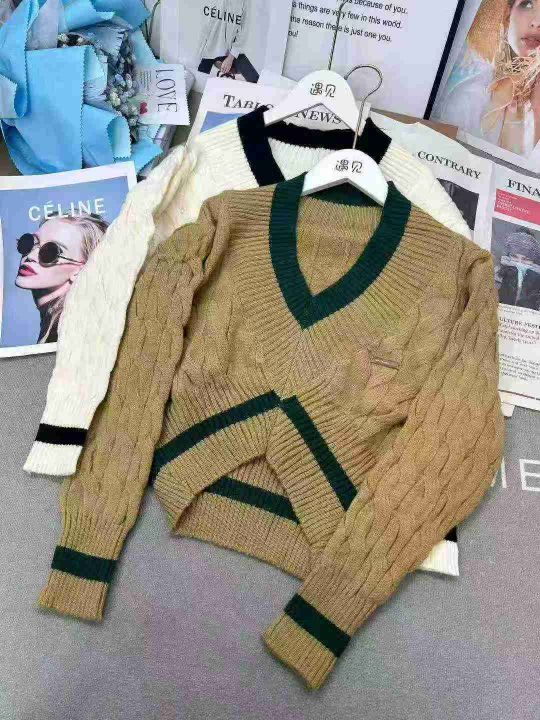慵懒风爆款麻花短款显瘦设计V领毛衣,整款2色,数量35...