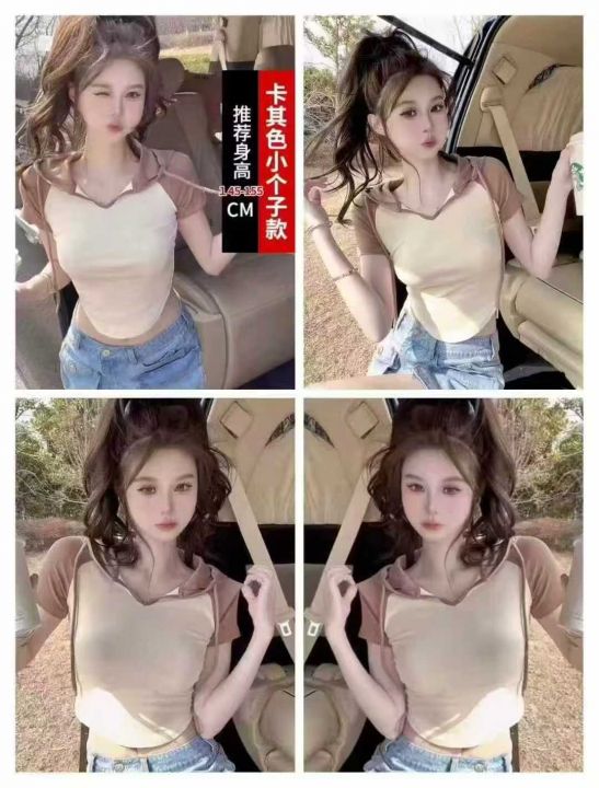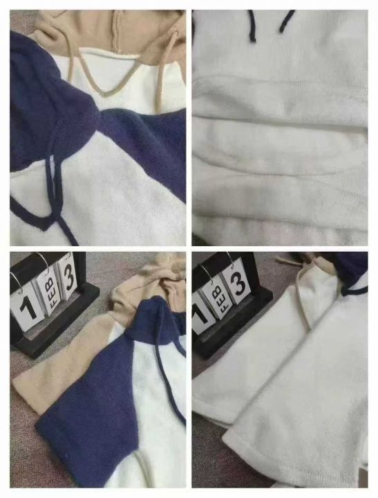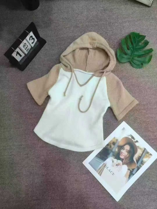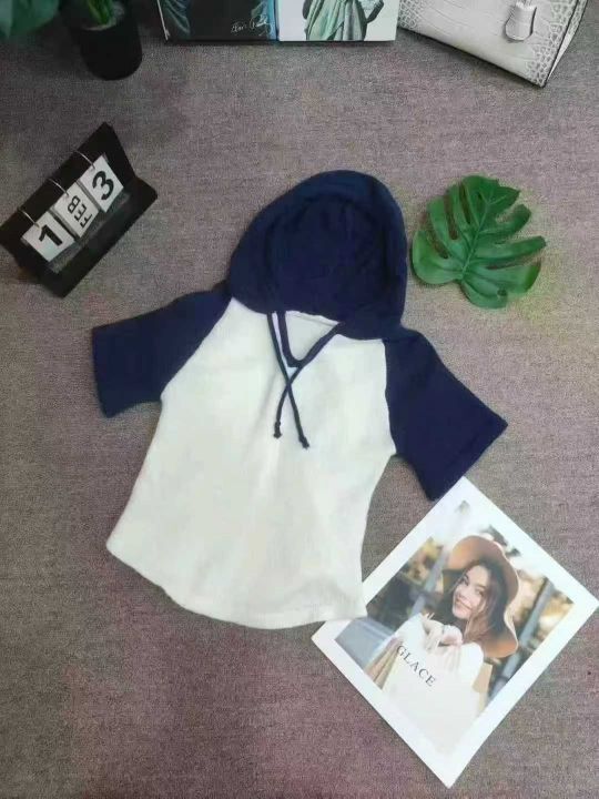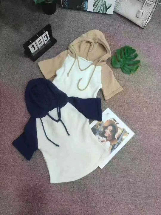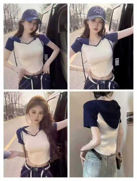 纯欲甜辣妹风撞色抽绳连帽弧形不规则针织衫短袖毛衣,独立包装,180件,清6.5,分➕5毛