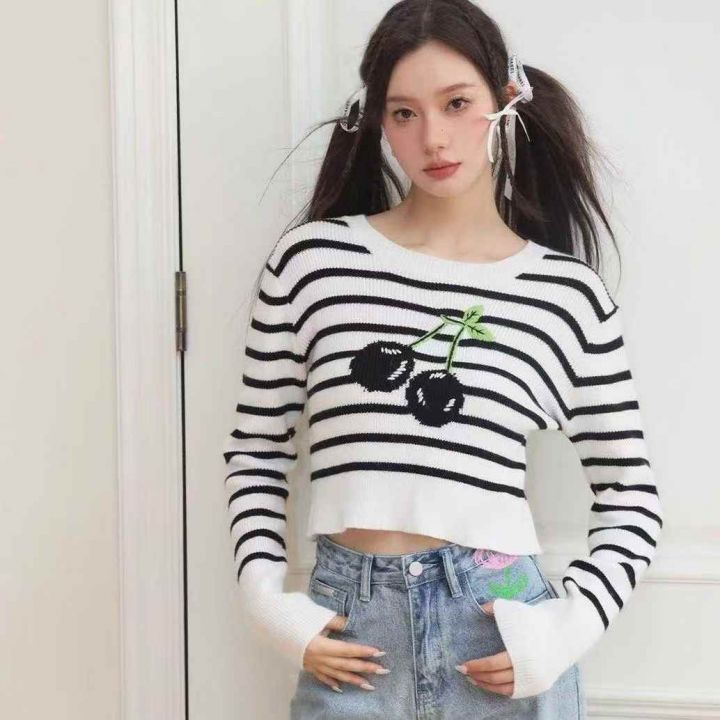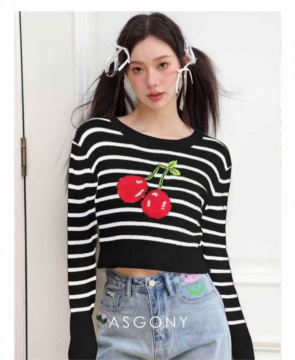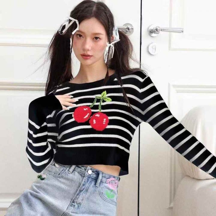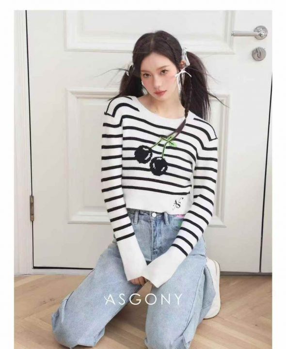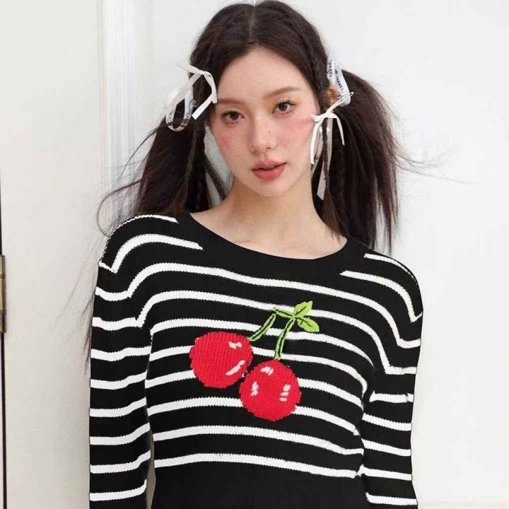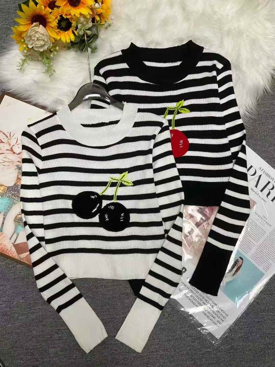 秋冬新款美式时尚辣妹樱桃刺绣植绒撞色条纹宽松显瘦套头毛衣,独立包装,均码面料柔软舒适弹力大,220件,全清6.9元超低价秒杀!