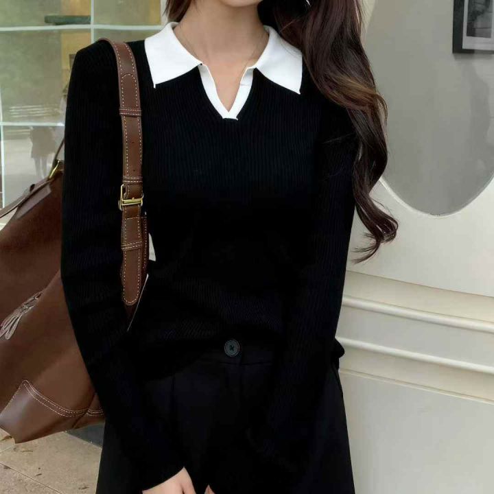 品牌原单秋季新品法式气质高级感Polo领长袖套头毛衣,...