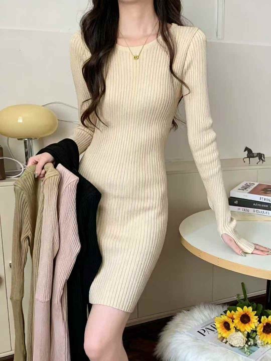 秋冬新款弹力修身显瘦坑条圆领毛衣连衣裙,独立包装,...