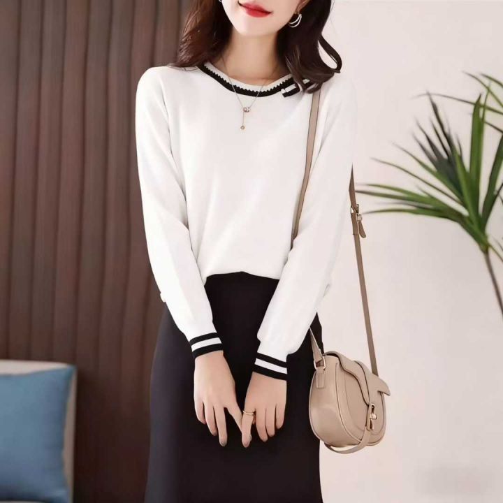 秋季新品小香风蝴蝶结装饰气质宽松显瘦针织圆领套头毛衣,独立包装,均码面...