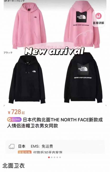 潮牌北面男女同款加绒连帽卫衣代购款前后印花,3色,M...
