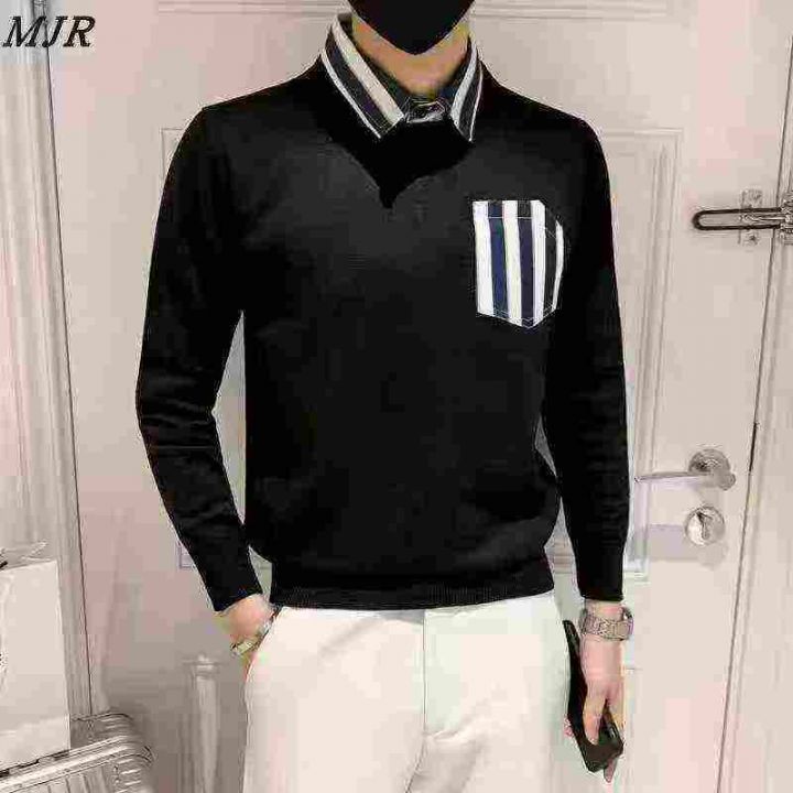 ☕️男士毛衣贴布衬衫领拼接假两件男士休闲复古毛衣英...